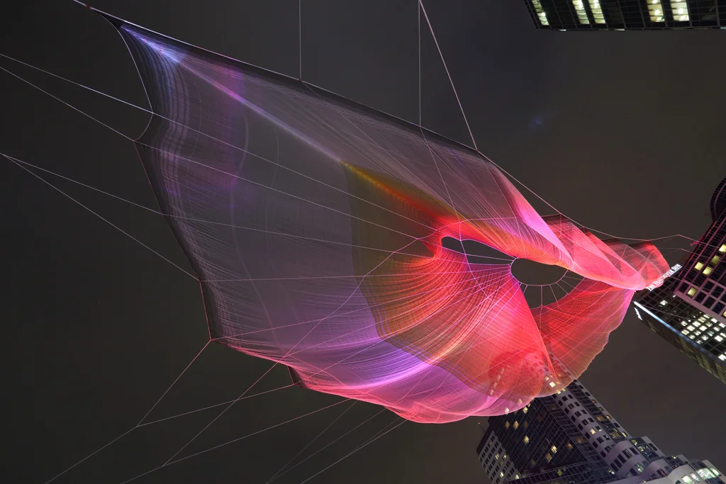 I am using a computer software tool from Autodesk to model something with this complexity at this scale, draped with gravity and wind. I invited Aaron Koblin, who is a creative director at Google Creative Lab, whom I had met as a fellow speaker at TED to create the social interactivity that I imagined but could not create myself. He's been creating a new way that people can interact and literally paint the skies with lights using the mobile device in their pocket.