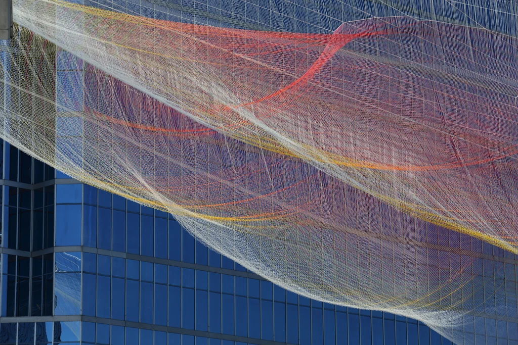 It was the first completely soft sculpture that became so light it could tie into existing buildings with a structure made of these soft engineered fibers fifteen times stronger than steel. This new fiber enabled it to be so light that I can literally lace into the structure of the city, into existing buildings, and alight through air space lacing over streets and pedestrian plazas. That was a breakthrough. This discovery came through the pressure of wanting to do a project for the Biennial of the Americas, but the time was too short and there weren’t resources for a permanent structure or a steel armature, and I had to figure some new solution out on the fly. Through the kindness of donation of these special fibers from Yale Cordage, we were able to test a new idea – an urban sculpture at this softness at the scale of the city.